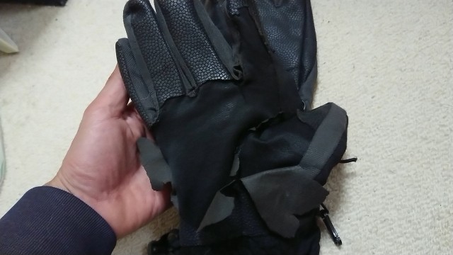 ボロボロになった上の画像の手袋は「防水タイプ」とお店に勧められて購入したが、その言葉を信じて土砂降りの日に利用した俺が馬鹿でした!