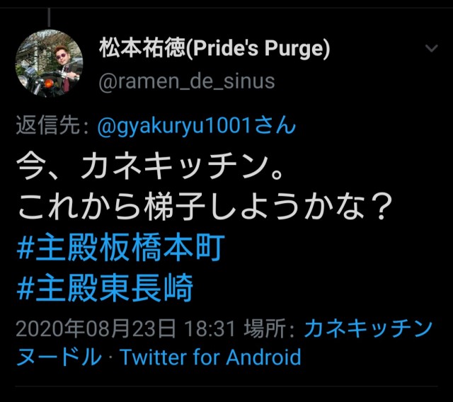 これから梯子しようかな?#主殿板橋本町 #主殿東長崎— 松本祐徳 (@ramen_de_sinus) August 23, 2020