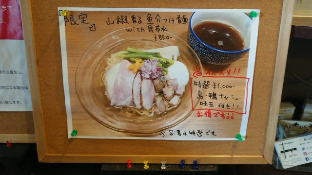 特選山椒香る魚介つけ麺 with 昆布水(特選なので鶏・鴨・チャーシュー付) 1000円