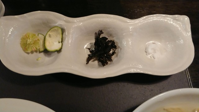 半分はつけめんの塩をつけて食べ、もう半分は塩ダレのつけ汁に入れて食べた。