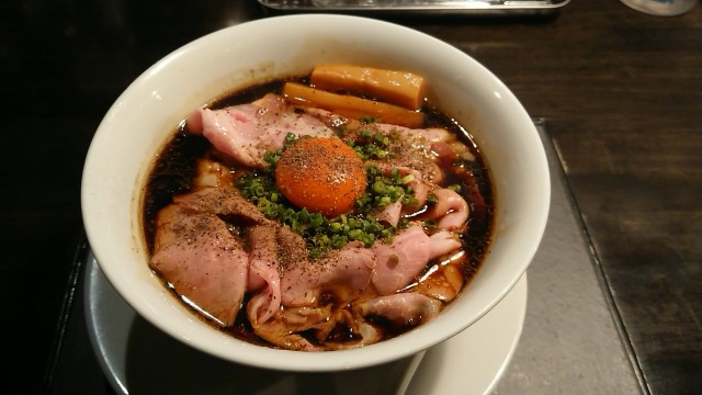 今夜は、金曜夜であり、本年の冷やし提供最終日にも関わらず、お店が空いていたので、塩田さんが「ブラック肉玉らぁめん」を特別に提供してくれた。