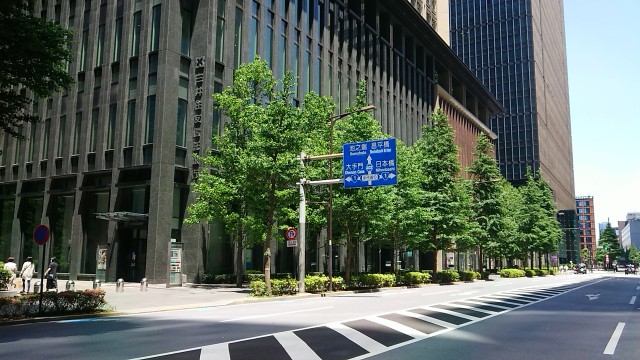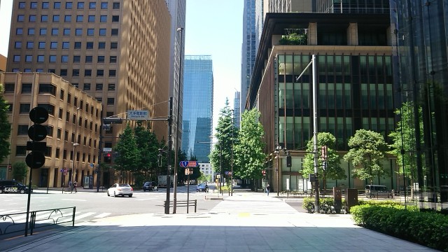 江戸時代の最高裁判機関「辰ノ口評定所」があった場所は右側の「丸の内永楽ビルディング」。