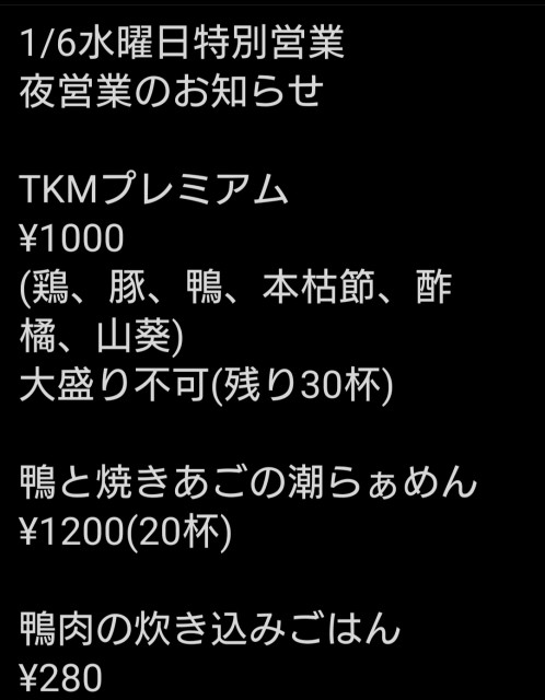 【カネキッチン】第4食 ①3時間インターバルで並盛6人前を平らげる! ②昼夜連続見込み客への配慮~夜の部は「TKMプレミアム」の他にもメニュー追加「鴨と焼きあごの潮らぁめん」 2021/01/06