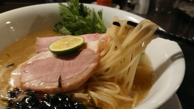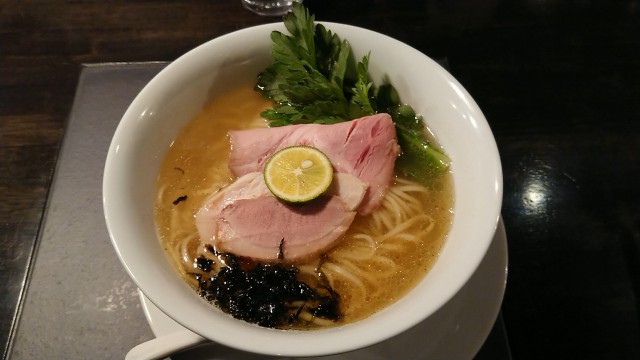 ※トッピングは、豚と鶏のチャーシュー、鴨肉、酢橘、春菊、岩海苔