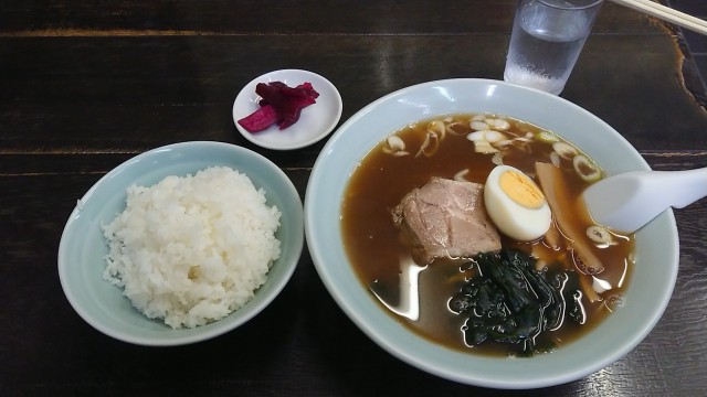 聞き取り間違いで、ラーメン単品で提供されたので、追加するようなかたちで、ライスとお新香が出された。
