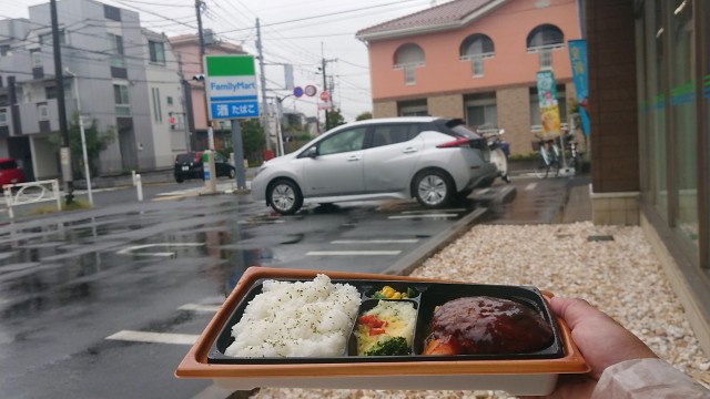Aちゃんとタソがいる、うちの地元のファミマ姉妹店(フランチャイズオーナーが同一店)で、ハンバーグ弁当を買って食べた。
