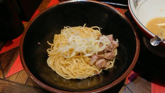 背脂つけ汁に、味付け白髪ネギと細麺を使った麺増サービスのつけ麺(1030円)