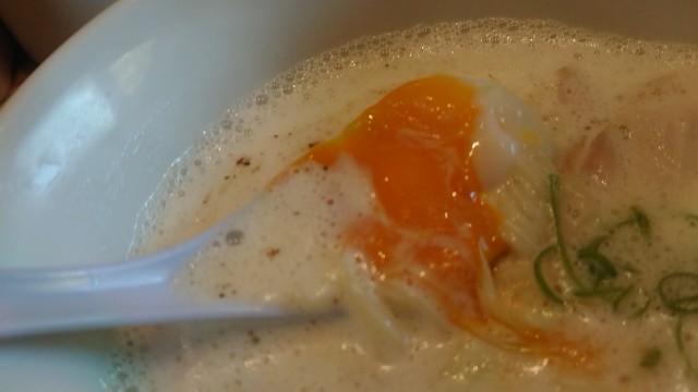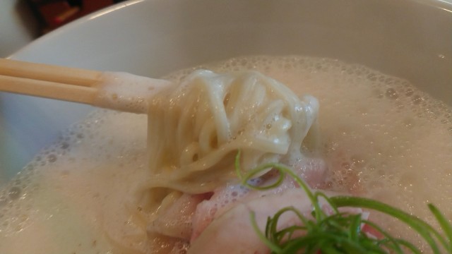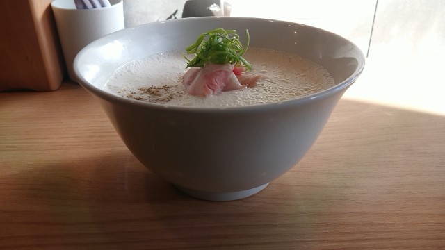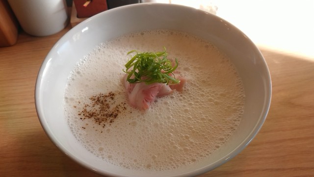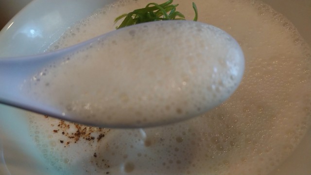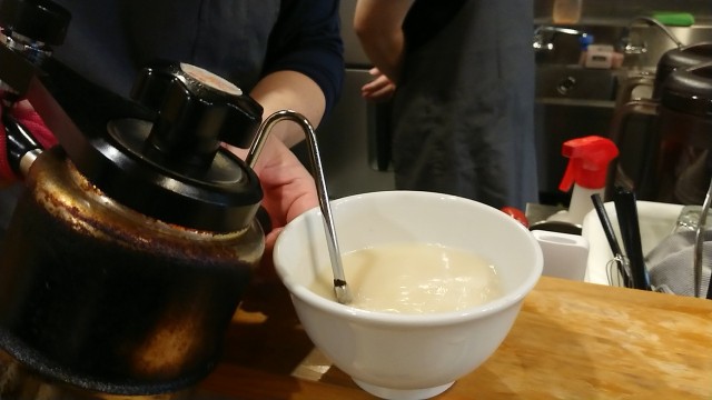 これは塩つけ麺のつけ汁に鶏油を入れて、撹拌機を使用して30秒程度ホイップし、白湯の出来上がり!って画像だ。