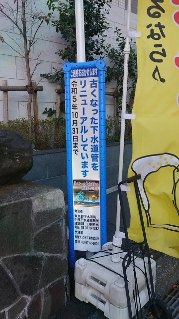 歩道域にホースを通しているので転倒や躓きに気をつけて頂くようアナウンスするのだ。