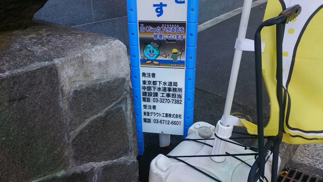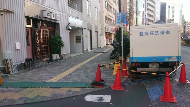 本日の日勤はマンションの排水管高圧洗浄に係る歩行者への注意換気。