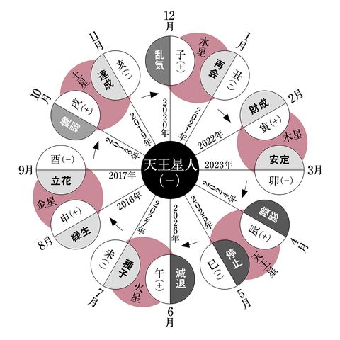ただ、〈財成〉はさまざまな面で収穫の多い運気ですが、一方で何か大切なものを失うときでもあります。転がり込んできた幸運を独り占めせず、周りの人や社会に感謝の気持ちを込めてお返ししましょう。