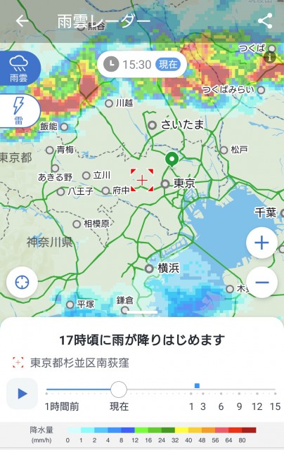 この雨は一時的なものだが、17:00以後のレーダーを見たら、本格的なゲリラ豪雨にやられそう。