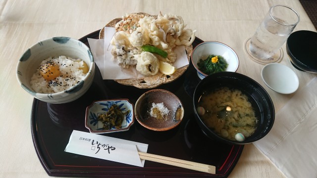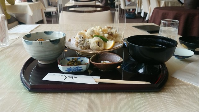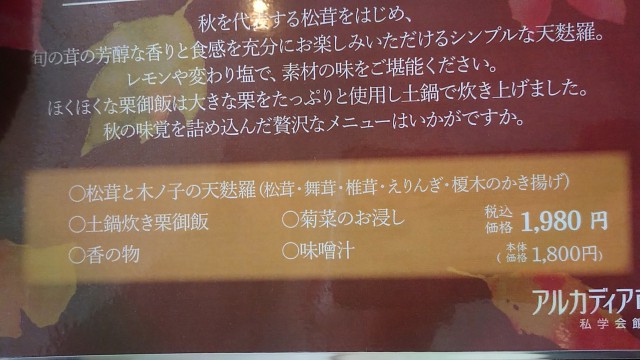 【レストランフォッセ アルカディア市ヶ谷私学会館】第1食 天つゆ不使用&魚介ゼロ 旬の味覚キノコの素材を生かしてレモンと塩と山椒で食べる「秋の峰定食1980円」(松茸・椎茸・舞茸・えりんぎ・榎のかき揚げ天麩羅/土瓶炊き栗御飯) 2022/10/15