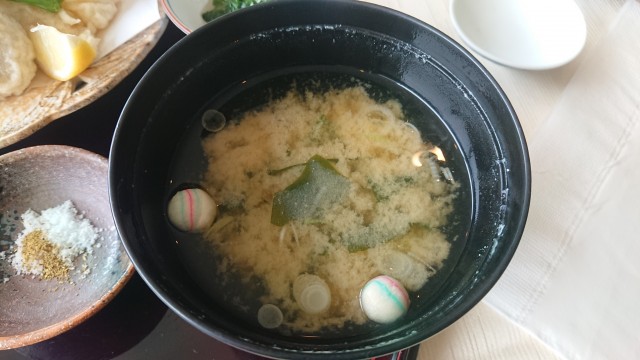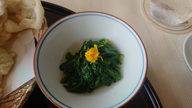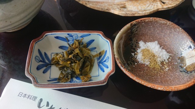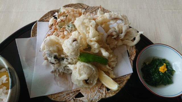 ①天麩羅(松茸・椎茸・舞茸・えりんぎ・榎のかき揚げ)と獅子唐辛子…レモンをかけて塩・山椒につけて食べる