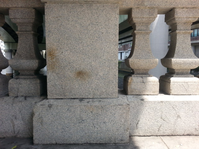 今も残る日本橋の関東大震災の焼け跡(橋の下にいた船が炎上した)