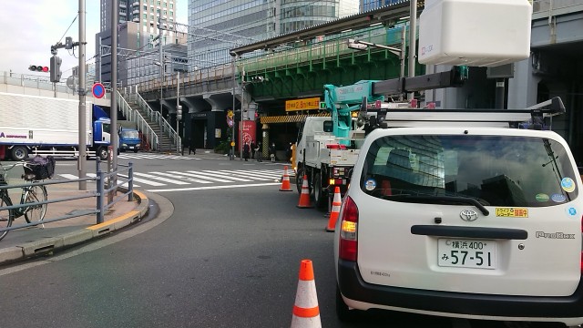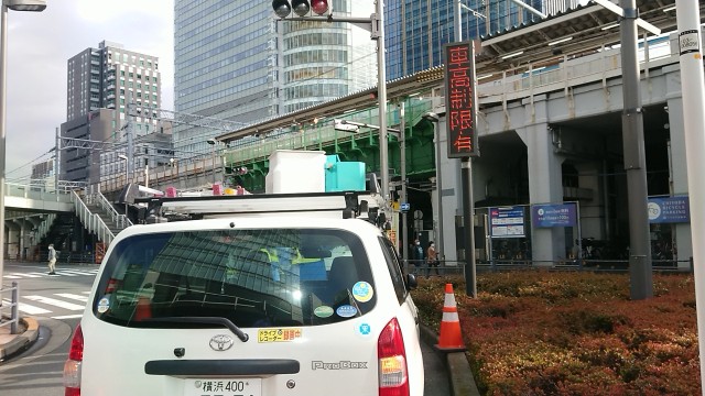 この高架下周辺の道路には車高センサーが設置されており、高さ制限に引っかかる車輌を事前に見つけて、音声警告する。