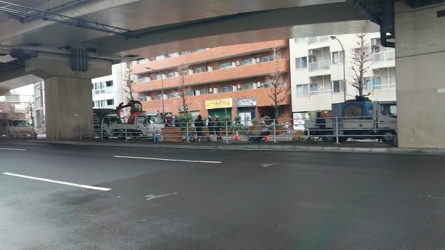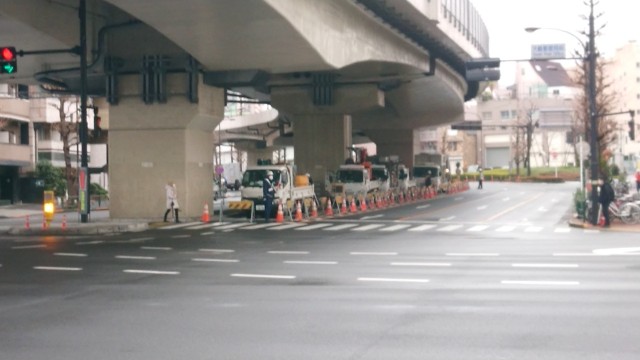 規制を組んだところは、カーブと首都高の高架の柱で見通しが非常に悪い。