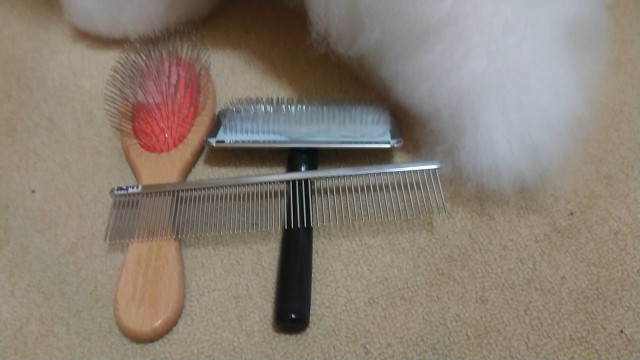 ピンブラシで編み編みをほといて、スリッカーで毛が引っかからないようにしてコーム(櫛)でとかす。