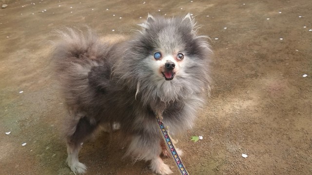 天気が崩れる前にそら(ポメラニアン・毛色ブルー・♂・13歳老犬・右目白内障)とお散歩。