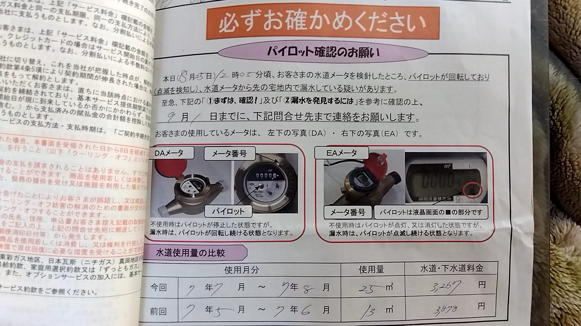 役所の委託業者に連絡する前に、予め、漏水箇所が何処か、屋外のメーターボックスと部屋を行ったり来たり、止水栓を開いたり閉じたり、汗だくになりながら調べた。