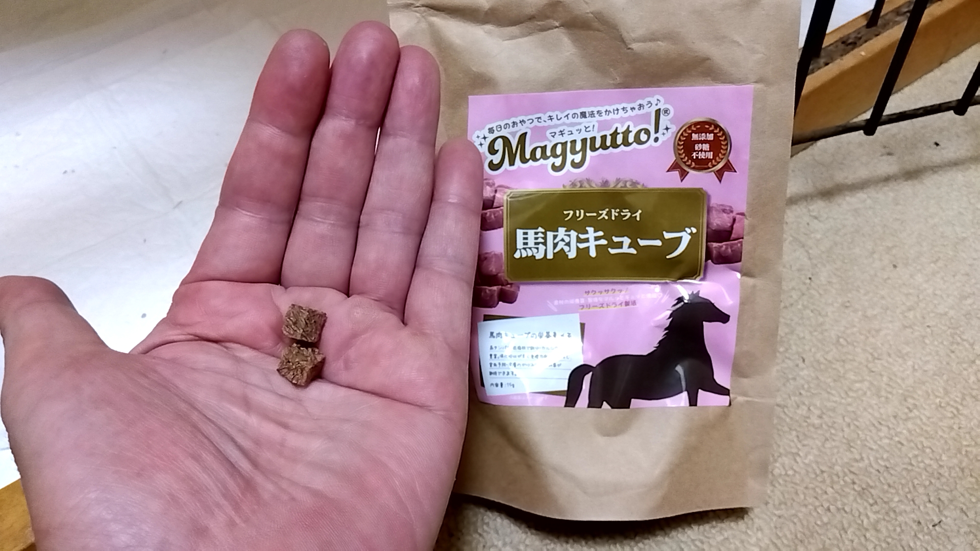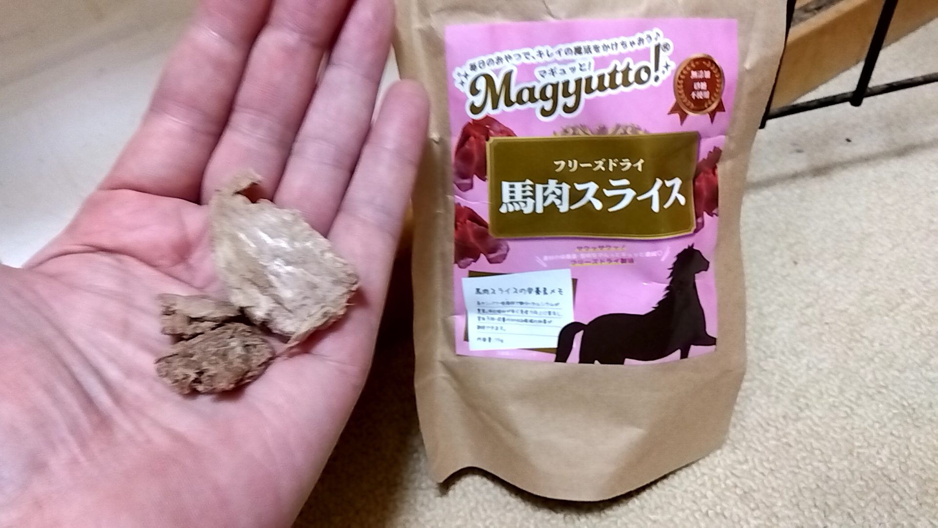 そして、ドライフード20gだけだと食いつかないので、馬肉スライス&パン生地をふりかけて(合計0.2g程度)、食べさせた。