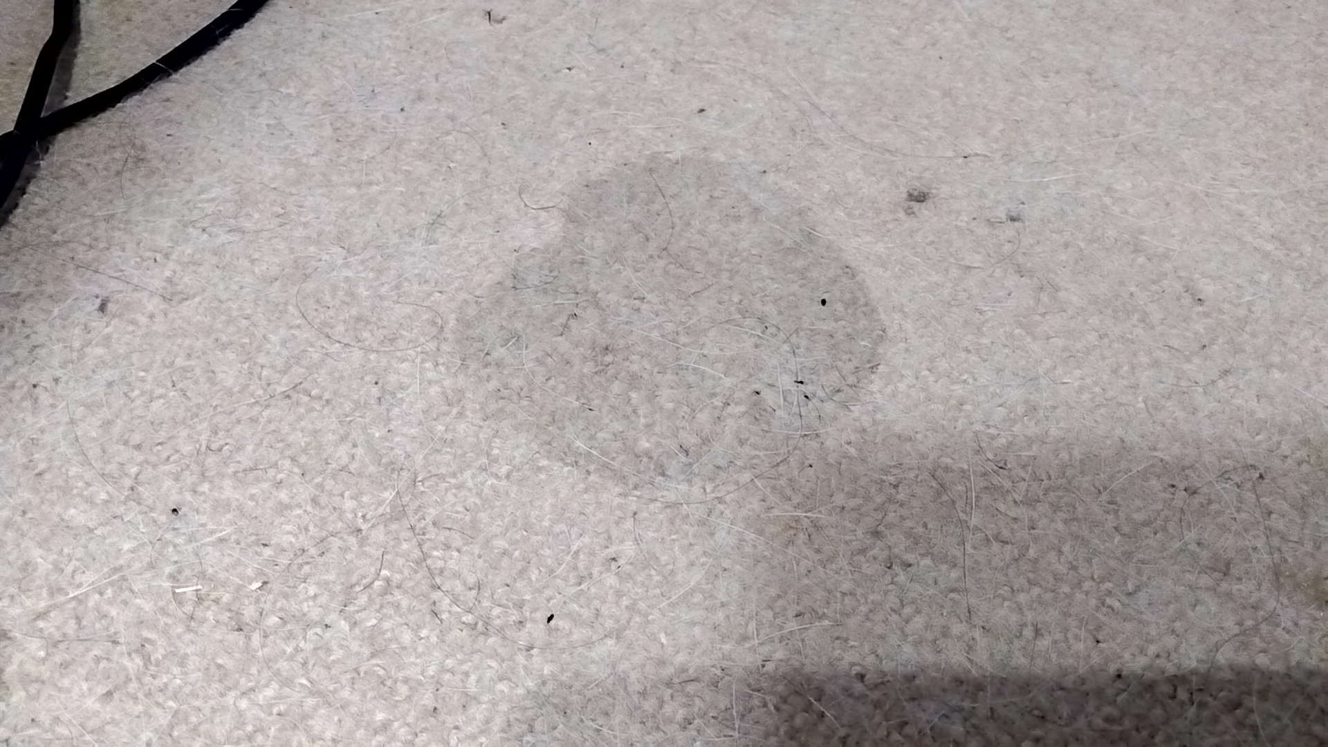 朝ごはんの支度中、トイレ(サークル)にたどり着けず、寝室のカーペットで放尿してしまったプリンスくん。