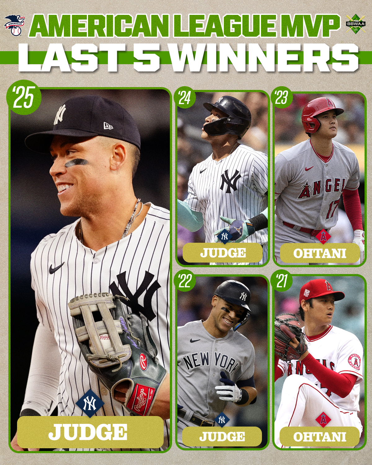 Aaron Judge and Cal Raleigh discuss their incredible 2025 seasons ahead of the AL MVP reveal on MLB Network! 📺 pic.twitter.com/LfvNKj0Vei