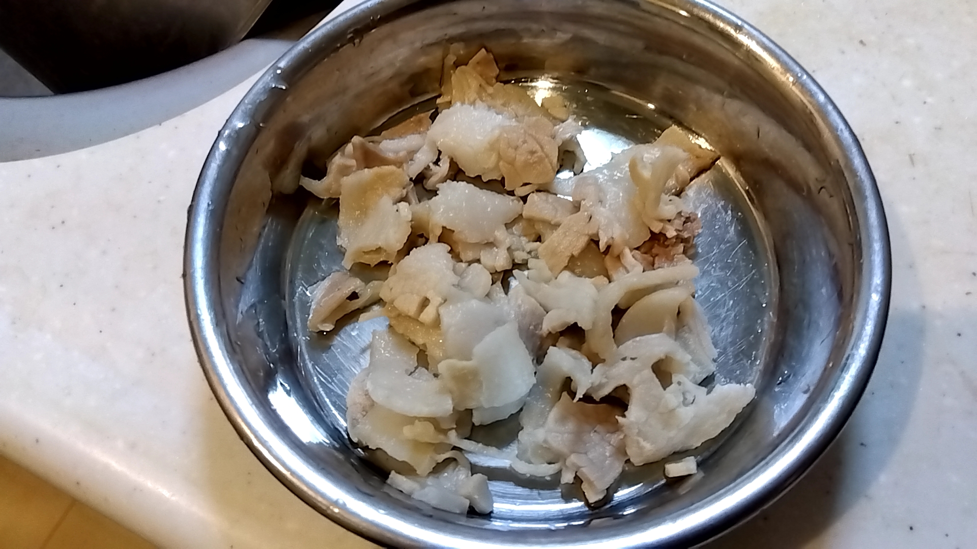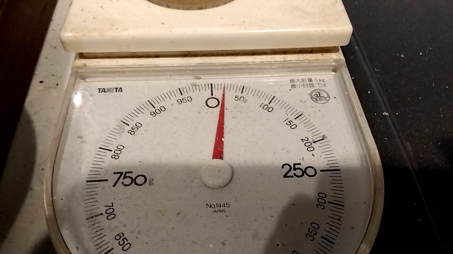 豚肉が何gあるか計量し、ドライフード量を決める。