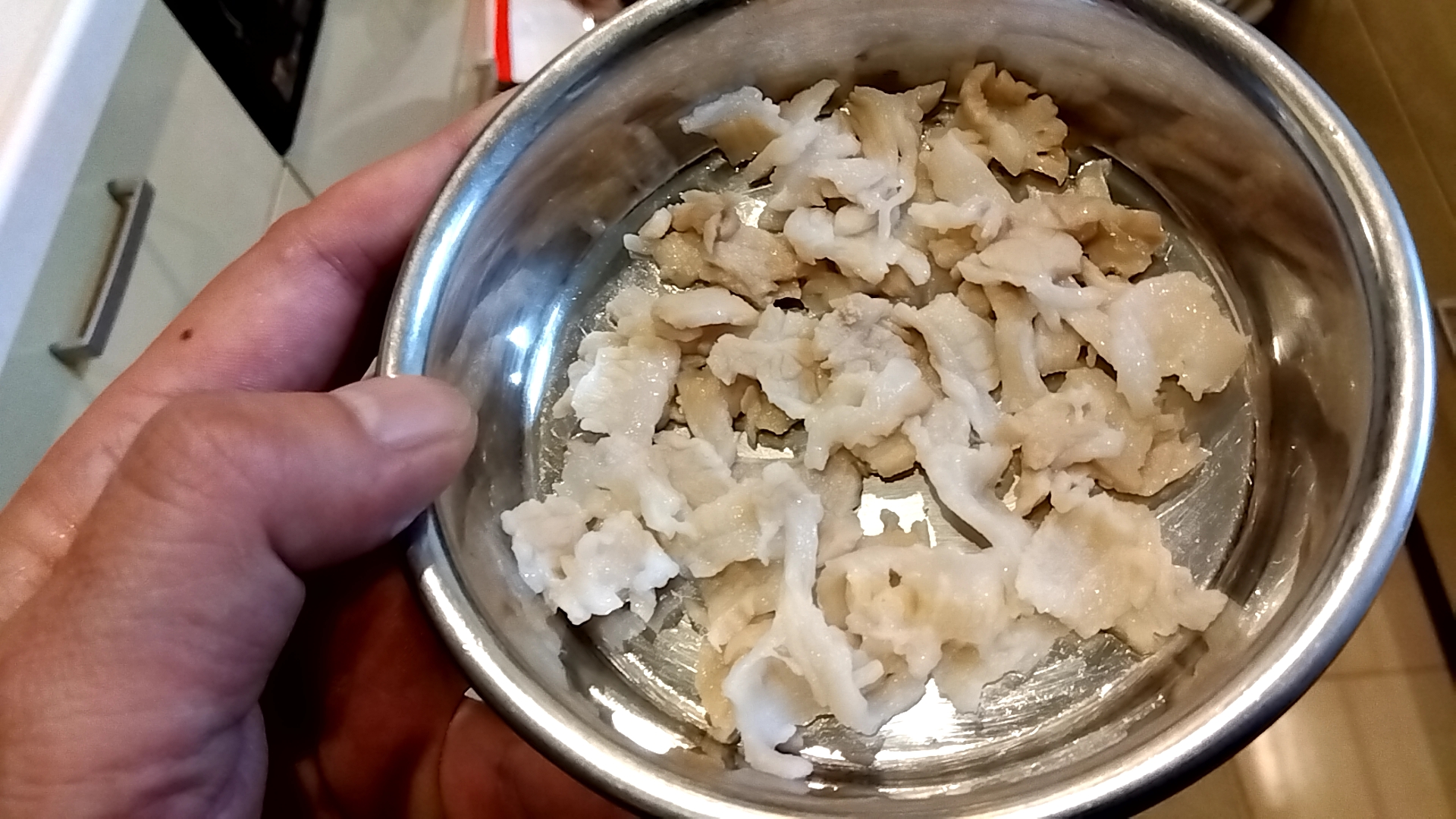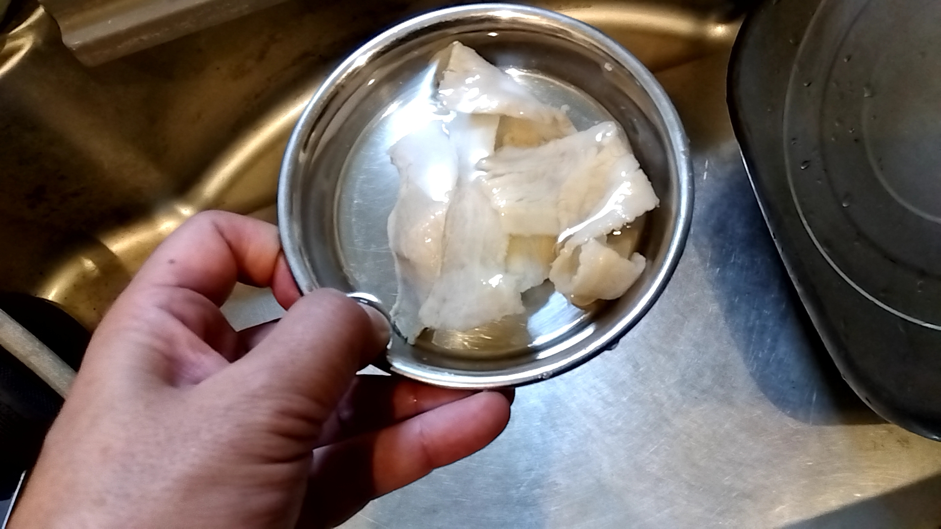 味がついた豚肉を水道を流して濯ぐ(画像は濯ぎ後、水に漬けたのじろう豚肉)