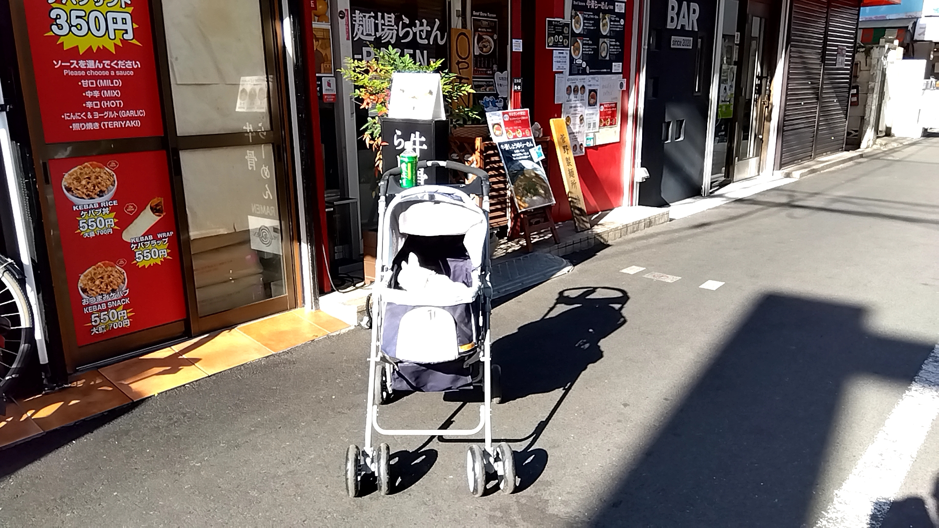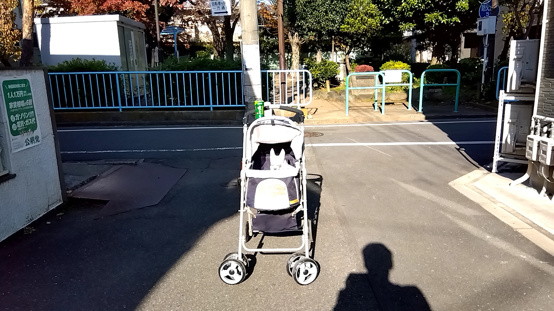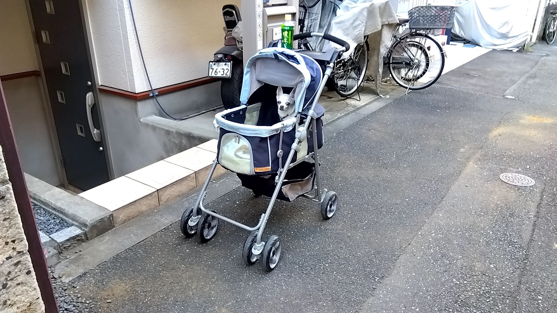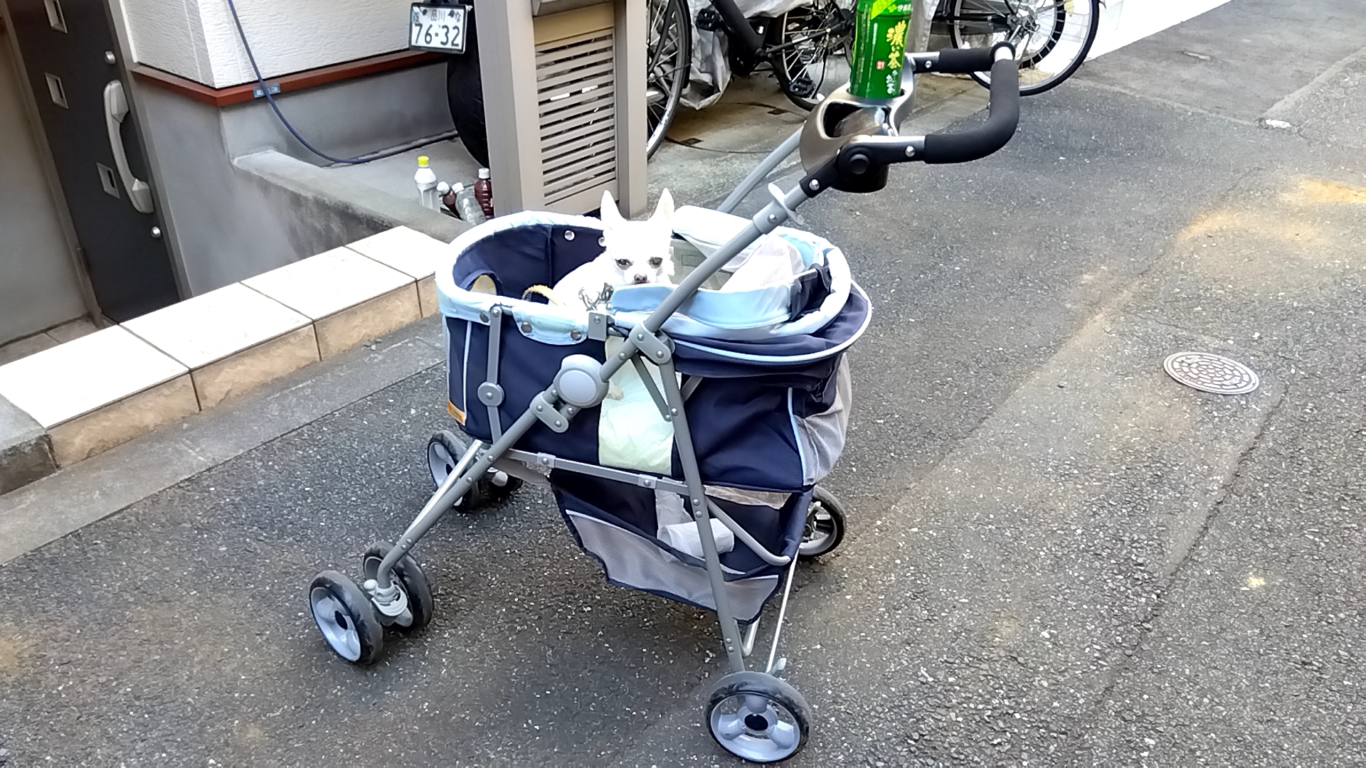 気温20℃の暖かい日差しに包まれて、タオルケットなしで、プリンスがペットカートに乗ってお散歩。