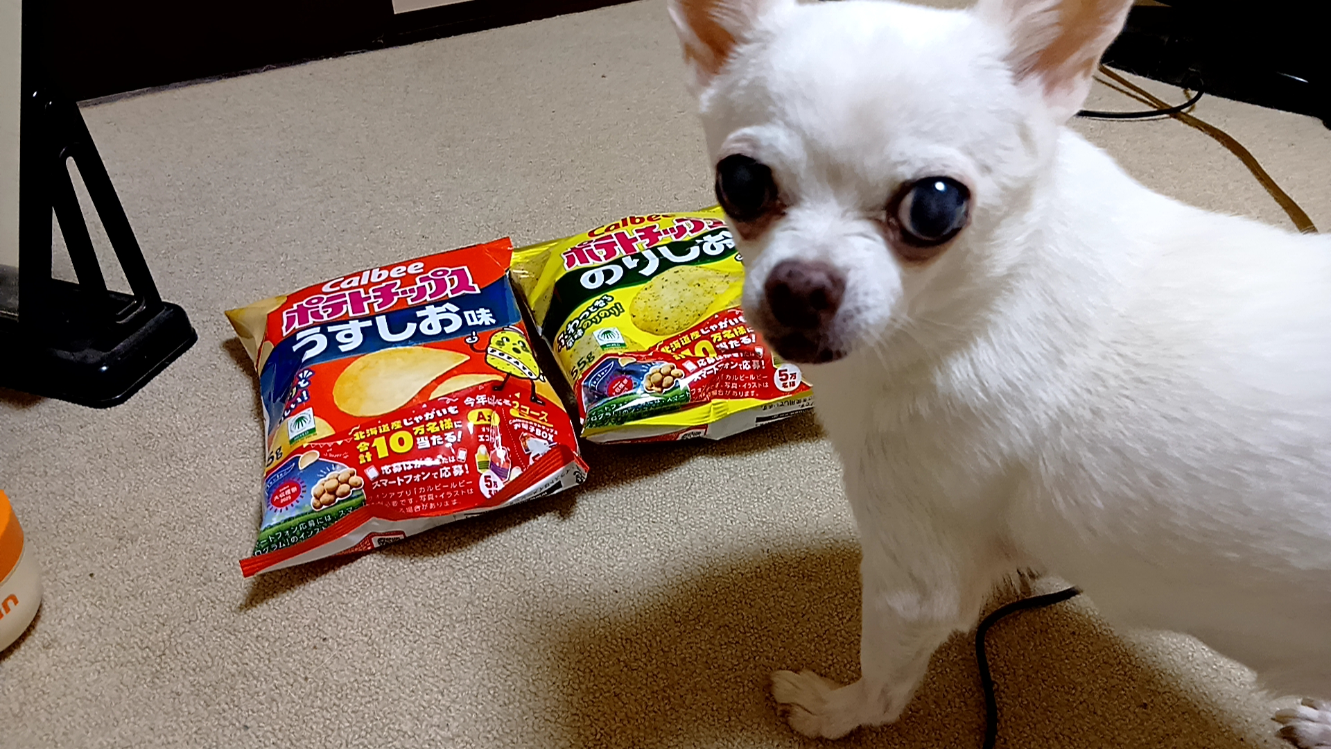 ビックカメラで貰ったカルビーのポテトチップスを見て、色めくプリンス