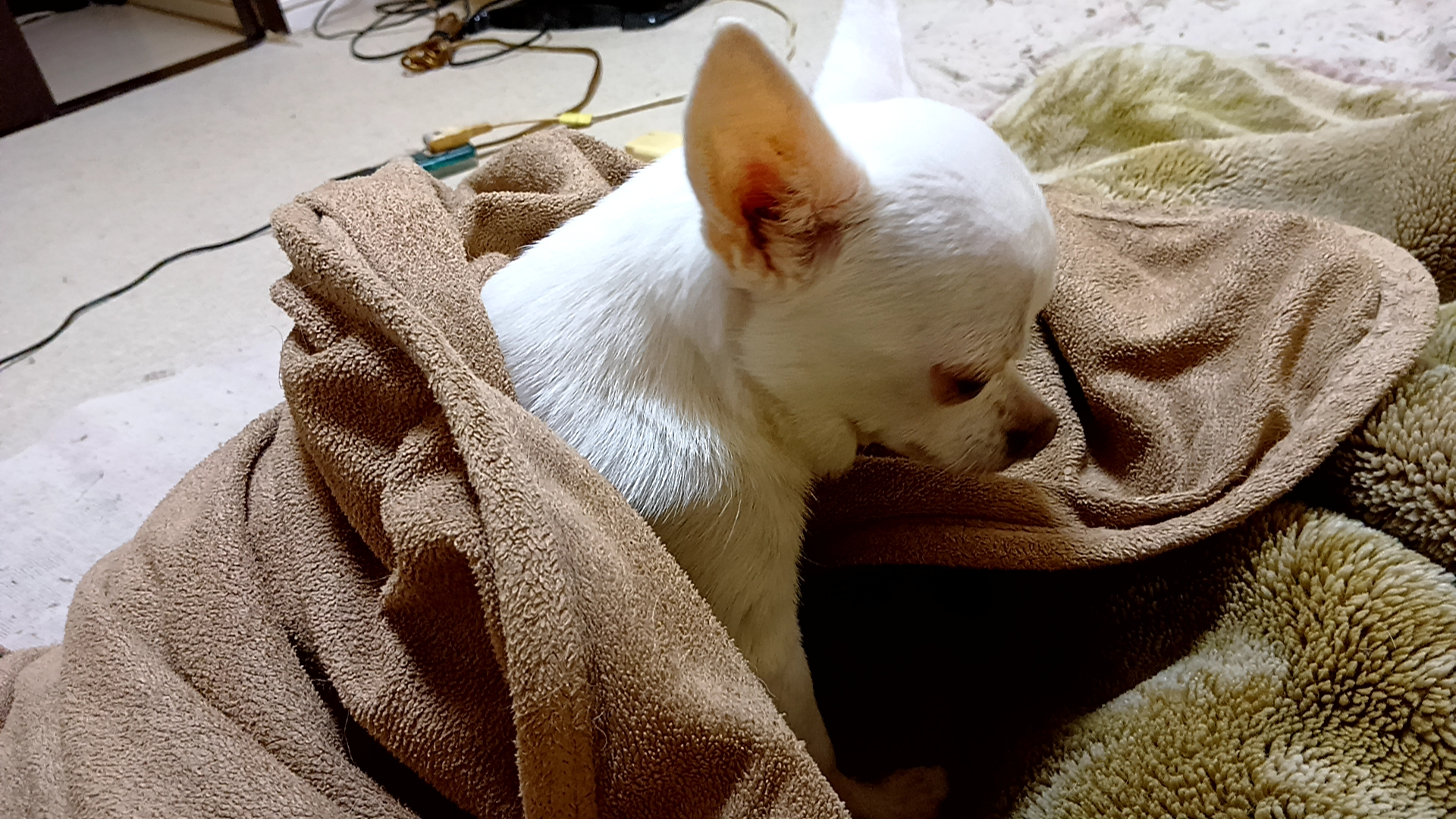 「匂いをつけよう」と、プリンスの身体に巻いた(掛け布団)