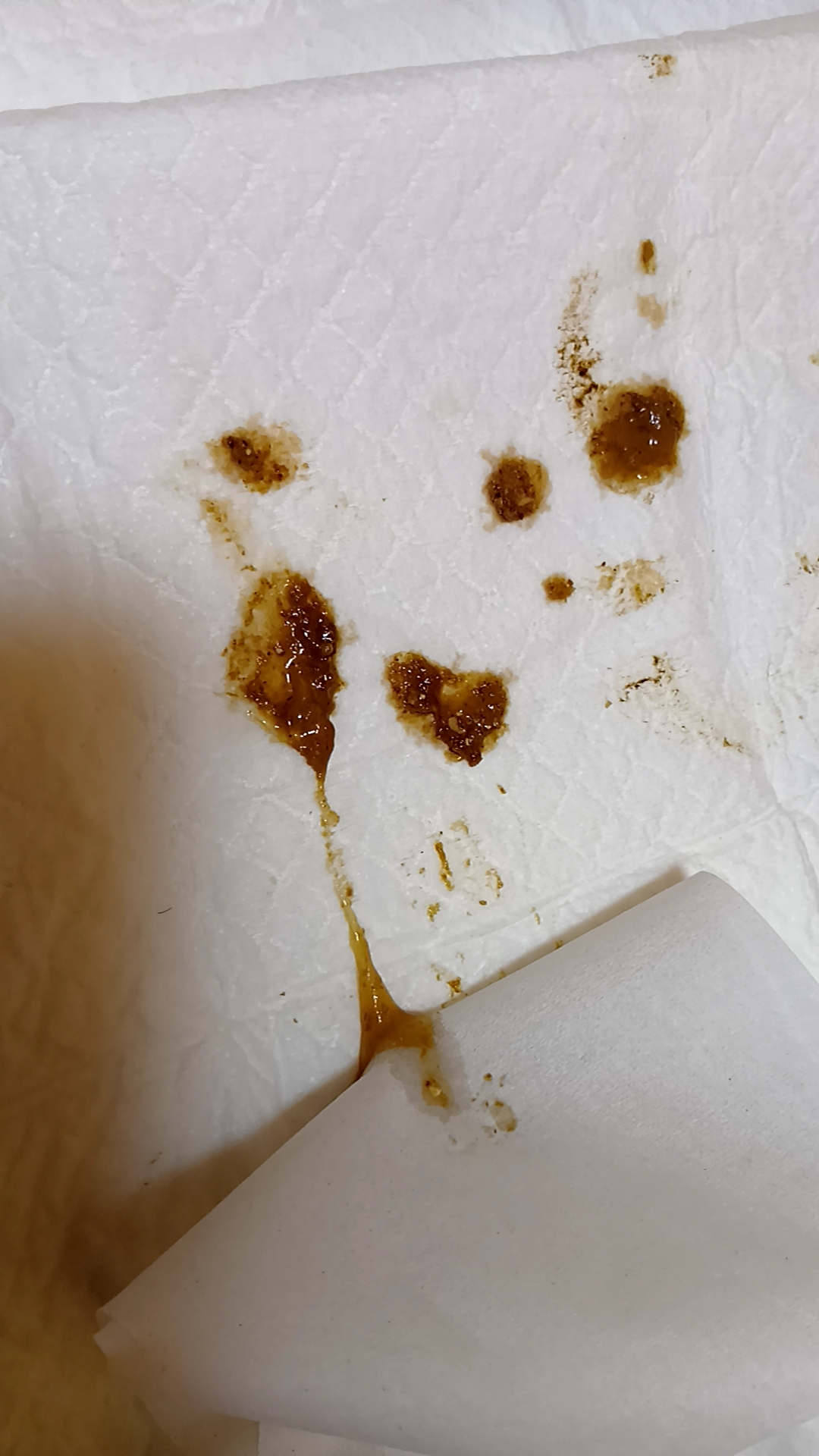 軟便だが、形はしっかりしており、粘膜便や血便ではない。