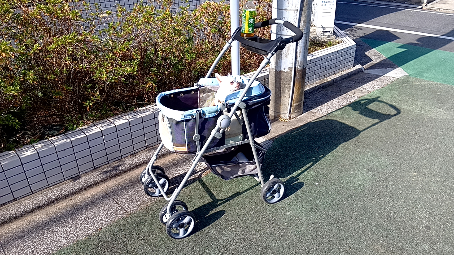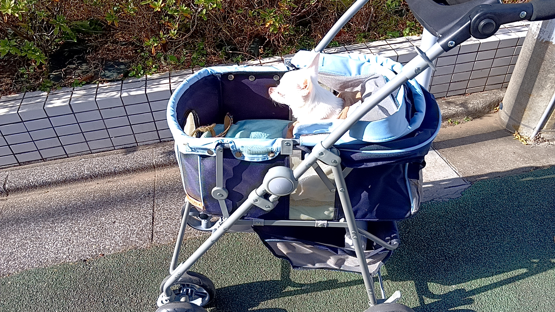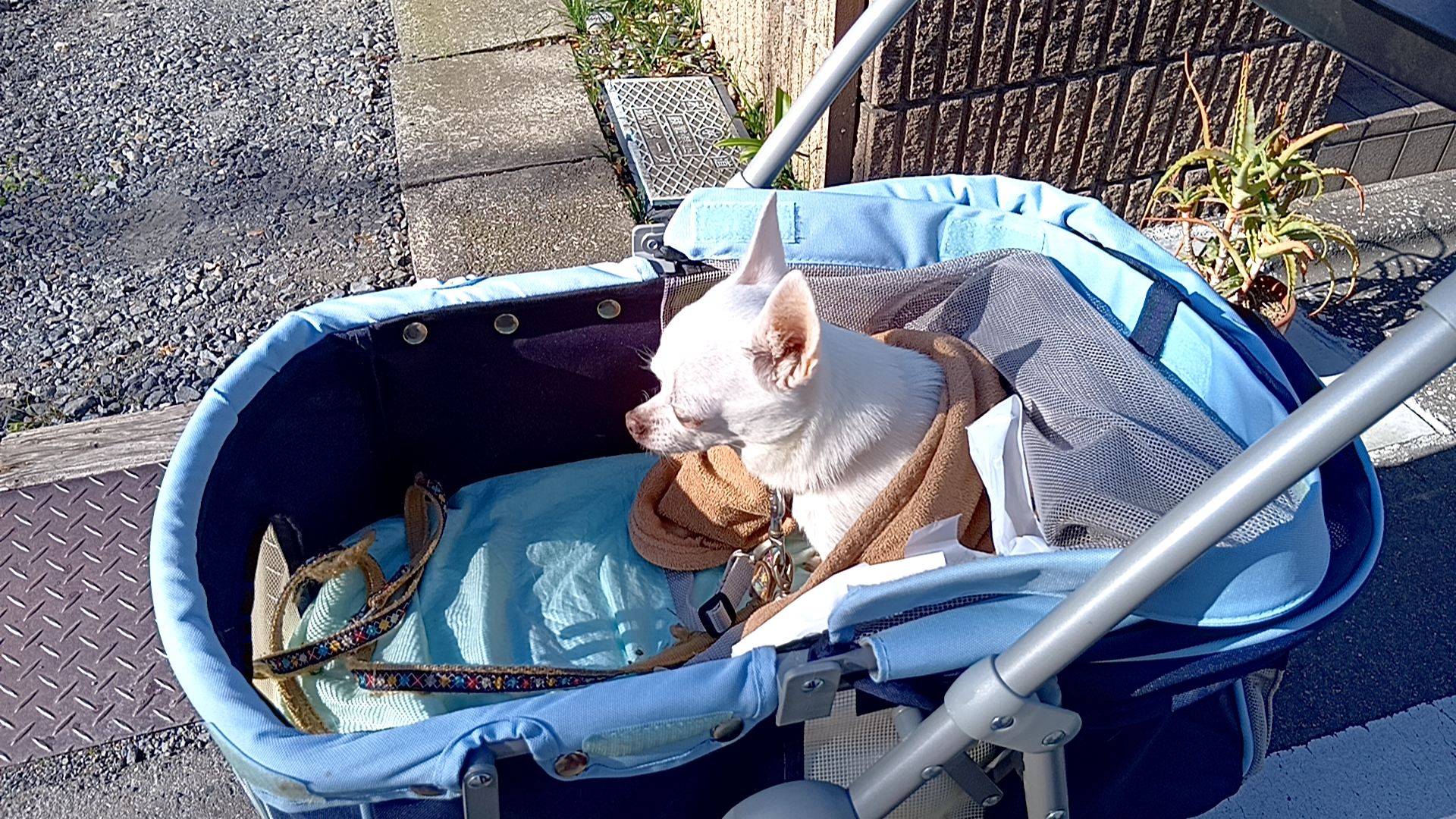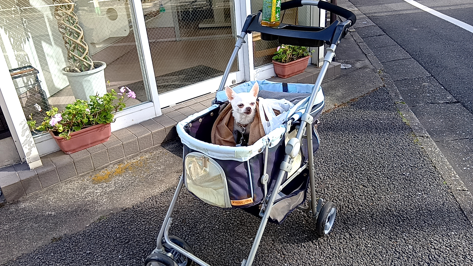 おすわりして、外の景色や匂いを楽しんでいたので真っ直ぐに帰宅せず、お散歩させた。