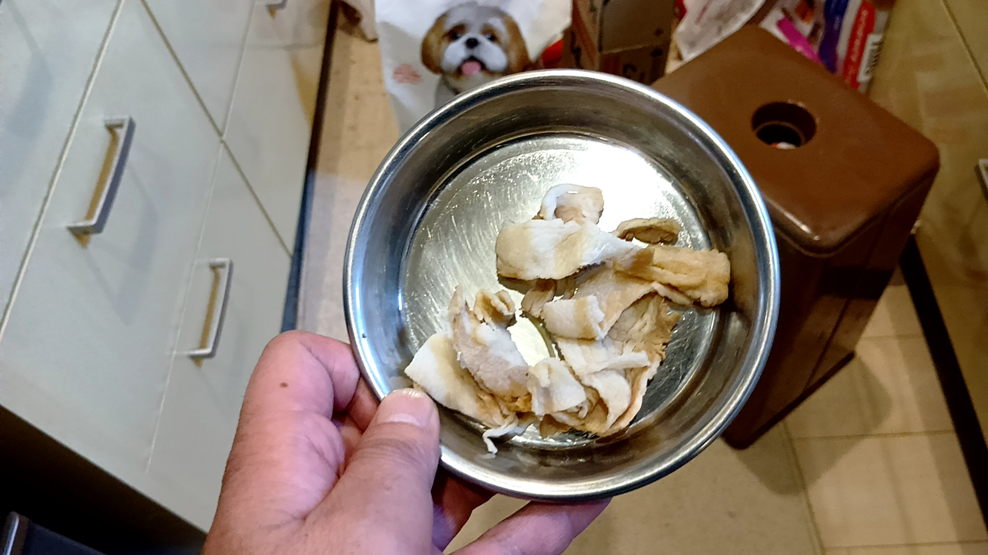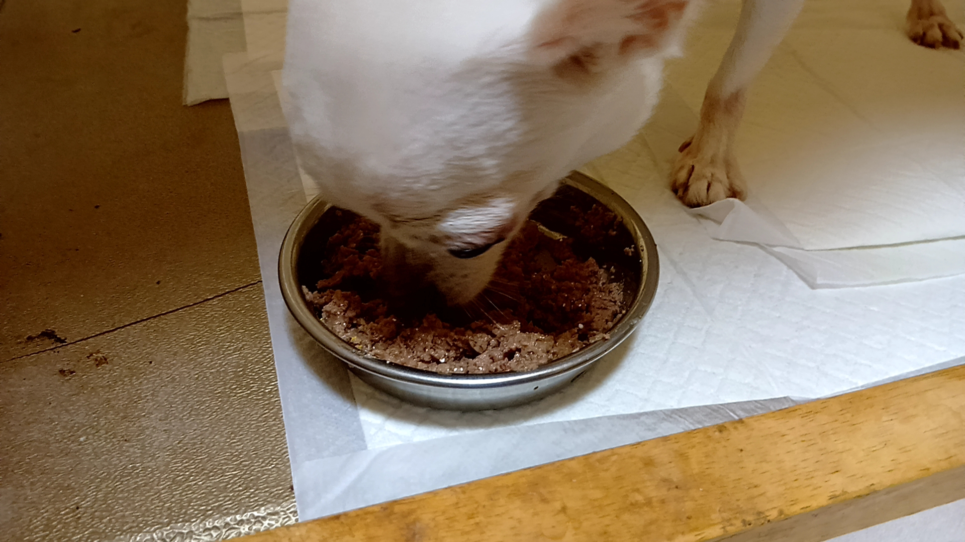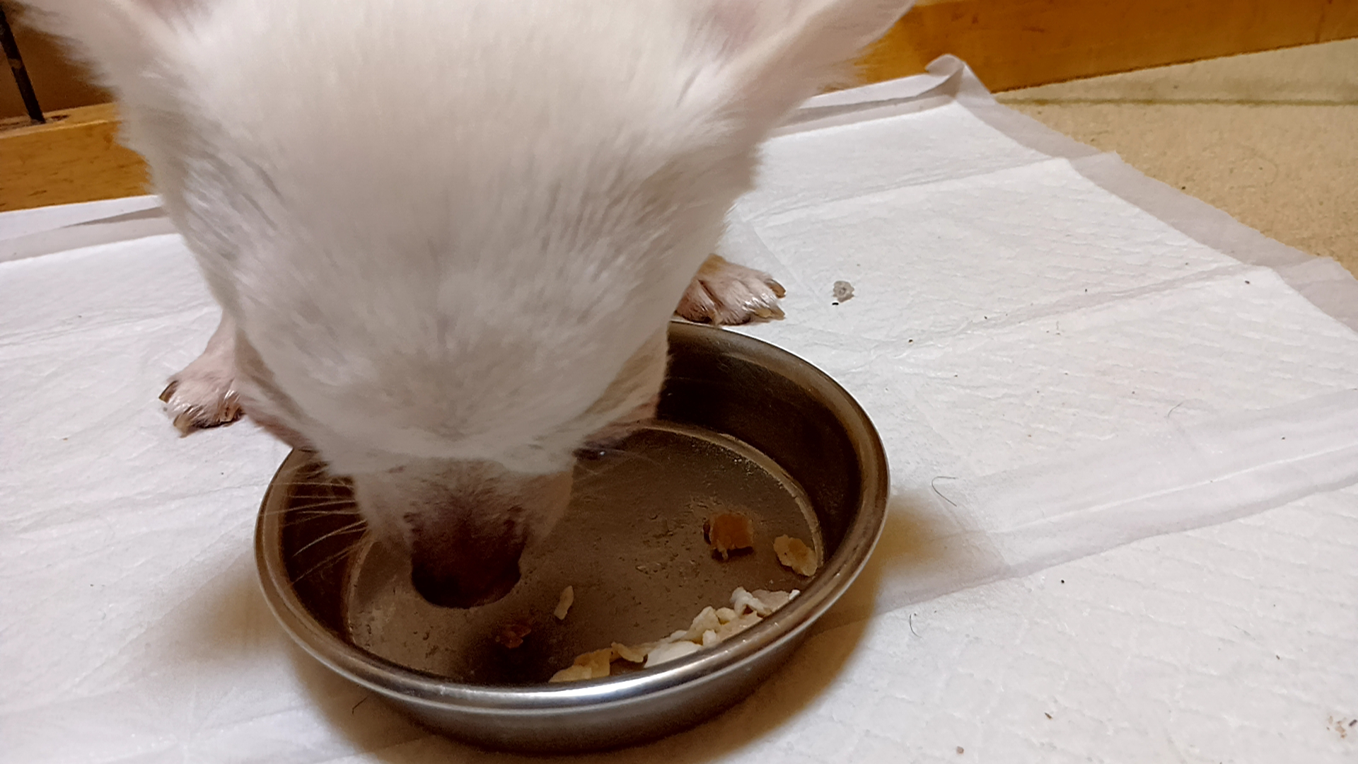 一昨日から露骨に点滴を嫌がるようになり、逃げ惑うプリンスに皮下注射して、豚しゃぶご褒美の前に、まずは、いつものご飯と内服薬(心臓病ピモベハート、腎臓病炭酸ランタン、整腸剤、凝固剤)の服用。