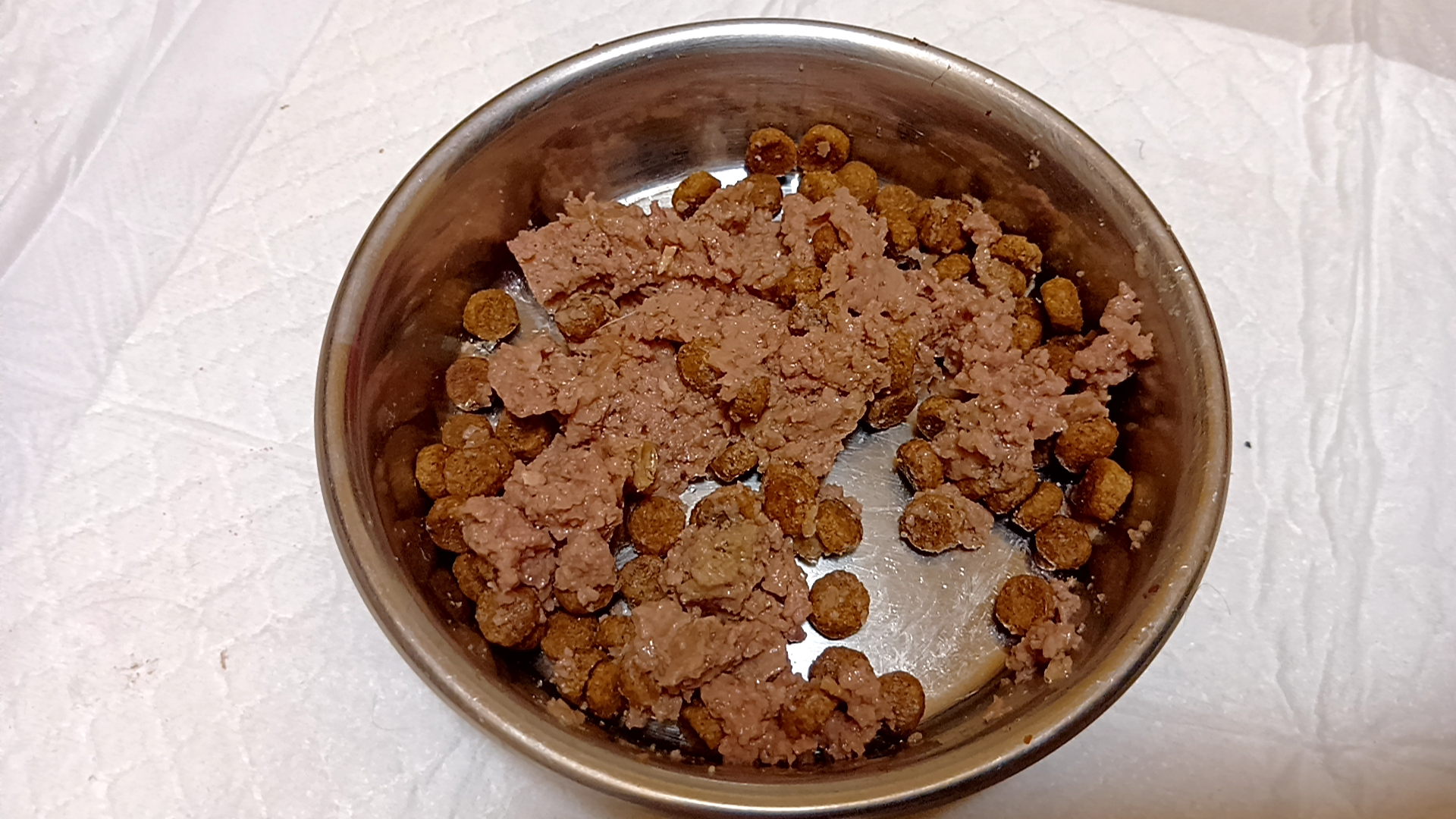 今朝は、ドライフード15gとウェットフード25gを給餌したが、足りずにワンワン吠えられて、ウェットフード25gを追加で与えたが、皿まで舐めてきれいに完食。