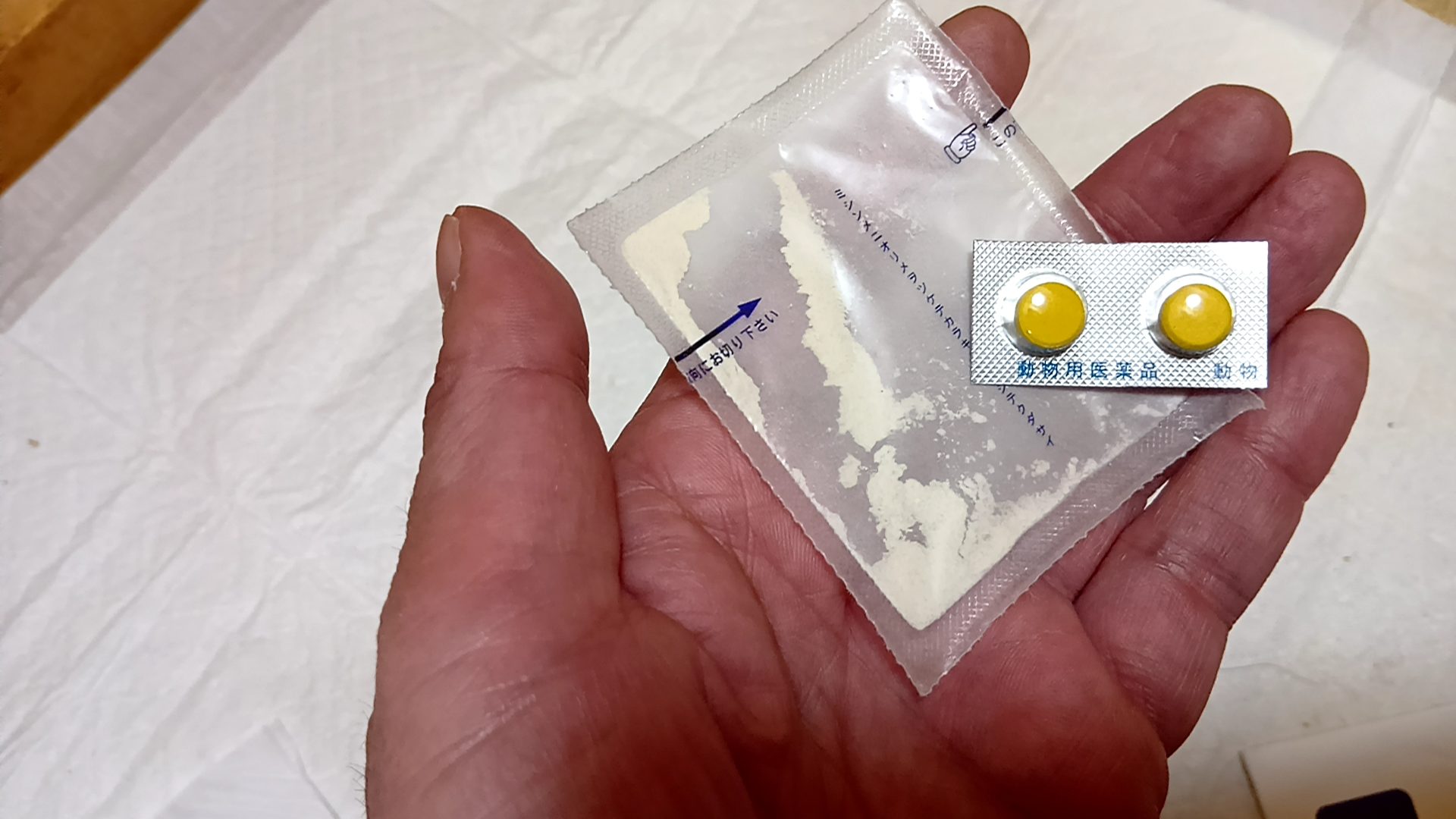 12/13午前、ちはや動物病院で胃腸炎治療用に、以下①〜③を処方されてから8日目に漸く完治した。