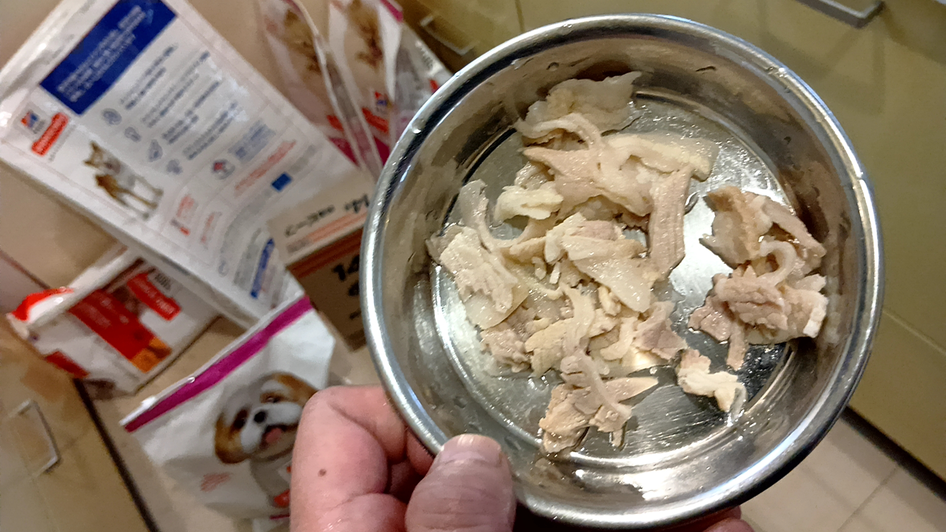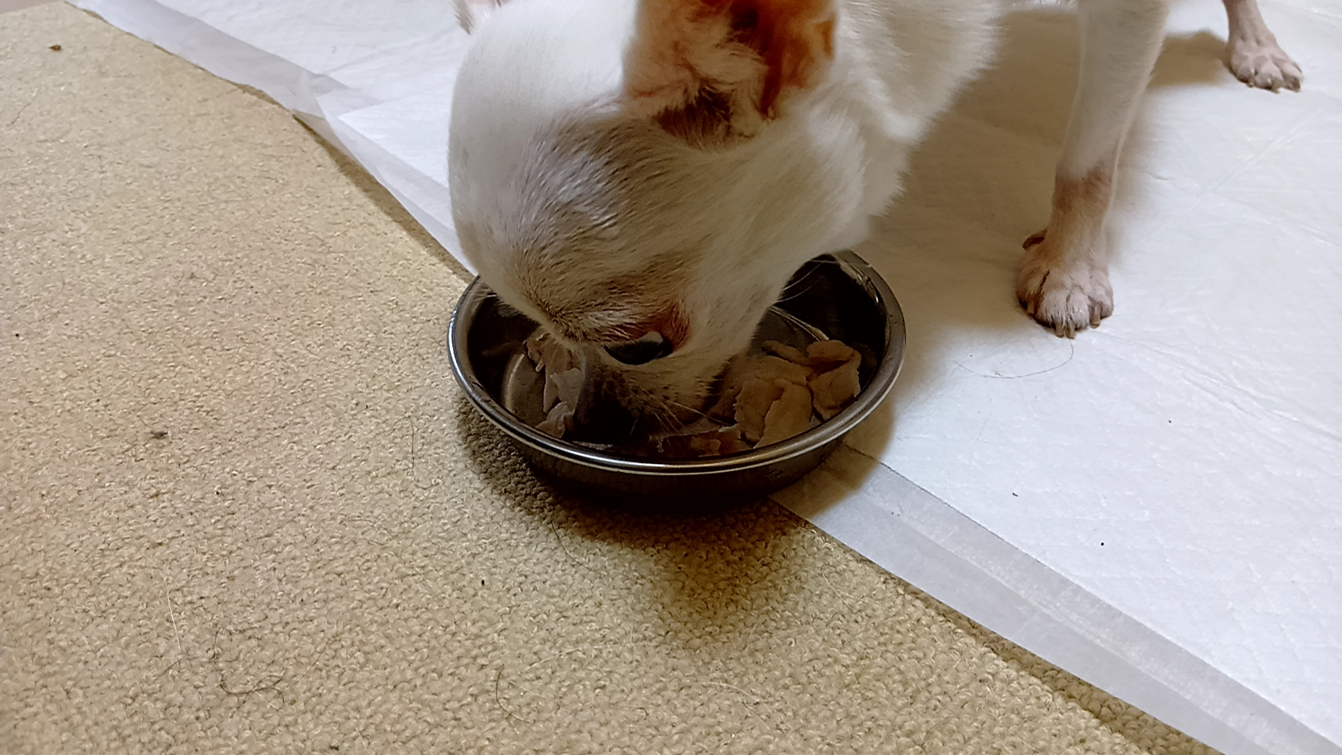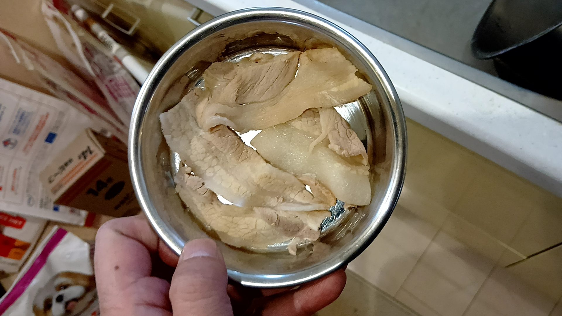 医薬品の仕分け中、豚肉の匂いでワンワンせっついていたプリンスにご褒美です。