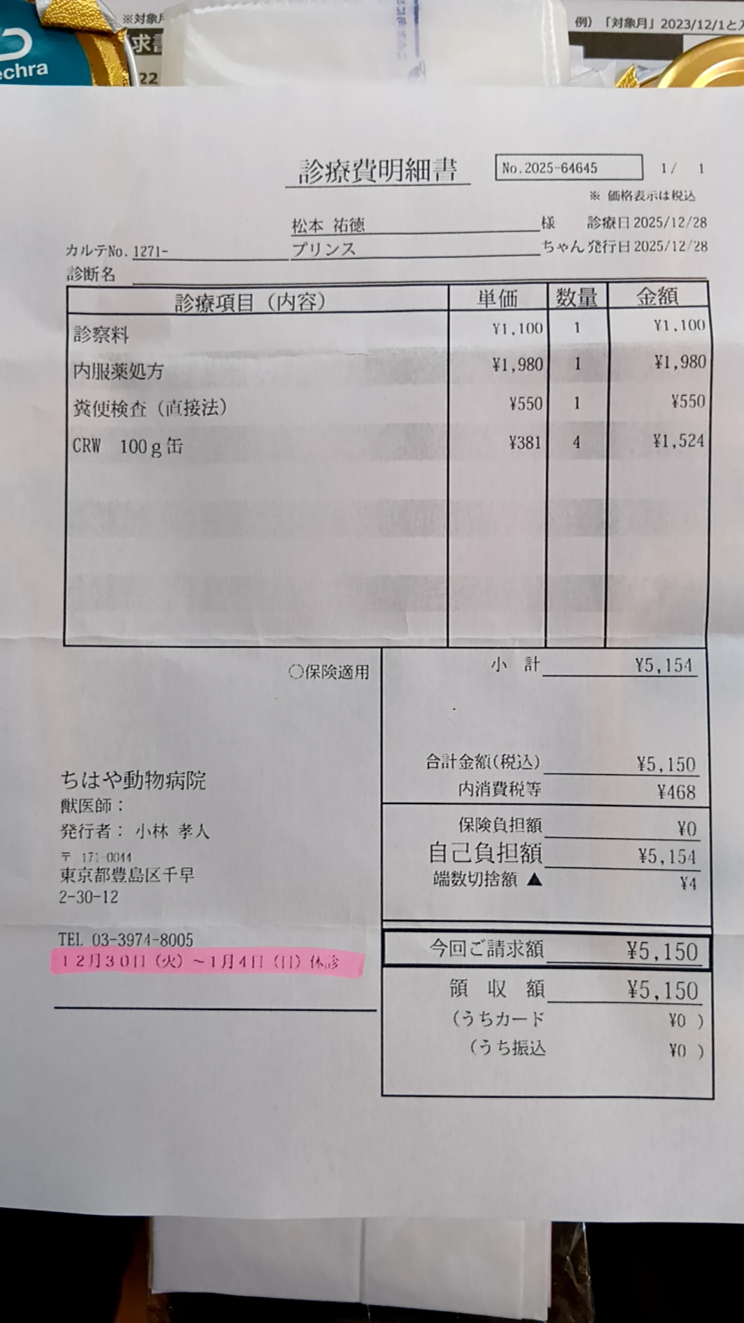 年末年始(12/30-1/4)、動物病院はお休みになるので、検査用に下痢をサランラップに包んで、ちはや動物病院を受診した。