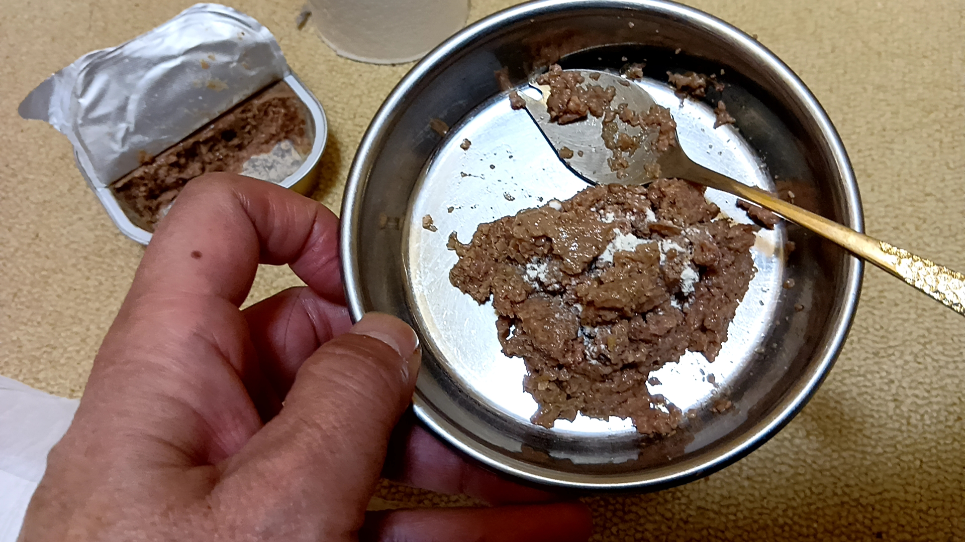 昼飯(麺場らせん)から帰宅後、ウェットフード25gに薬を混ぜて給餌した。