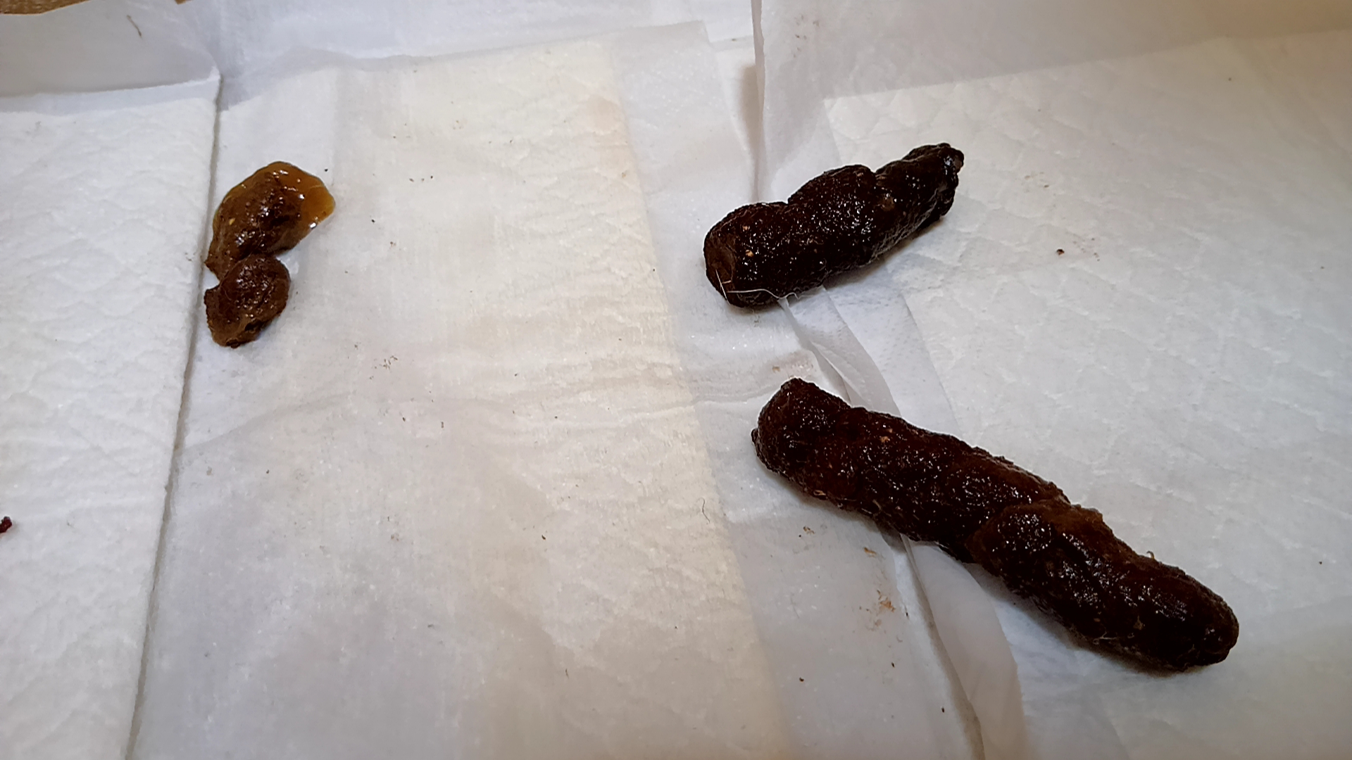 整腸剤を含んだうんち1本、残りは整腸剤を含んでいない粘膜付軟便。