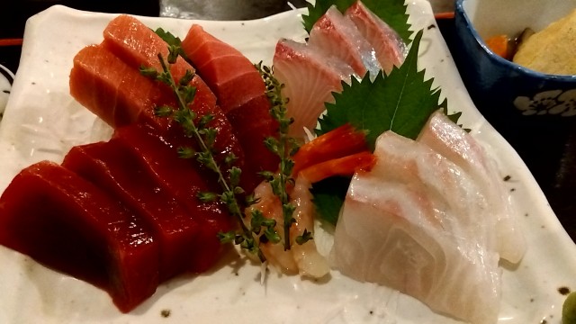 ①まぐろ・かんぱち・甘えび刺身お造り3点盛り+真鯛刺身お造りサービス 990円