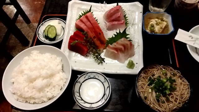 ①まぐろ・かんぱち・甘えび刺身お造り3点盛り+鯛刺身お造りサービス 990円