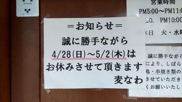ゴールデンウィーク休業期間スケジュールだが、もともと火、水が定休日なので、日月木3日がお店の臨時休業。