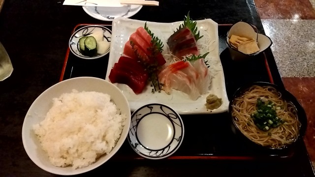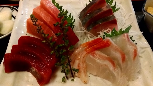 ①まぐろ・かんぱち・甘えび刺身お造り3点盛り+鯛刺身お造りサービス 990円