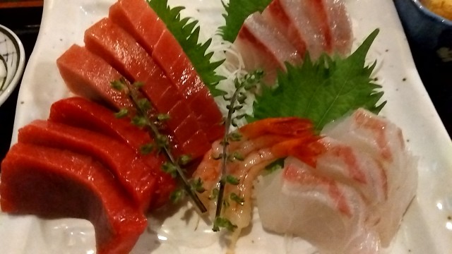 ①まぐろ・かんぱち・甘えび刺身お造り3点盛り+鯛刺身お造りサービス 990円