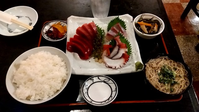 ①まぐろ・かんぱち・甘えび刺身お造り3点盛り+蛸刺身お造りサービス 990円