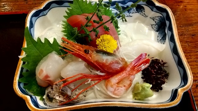 鮪、甘海老、烏賊、真鯛、鉄皮、大葉、穂紫蘇、紅たで、大根、菊