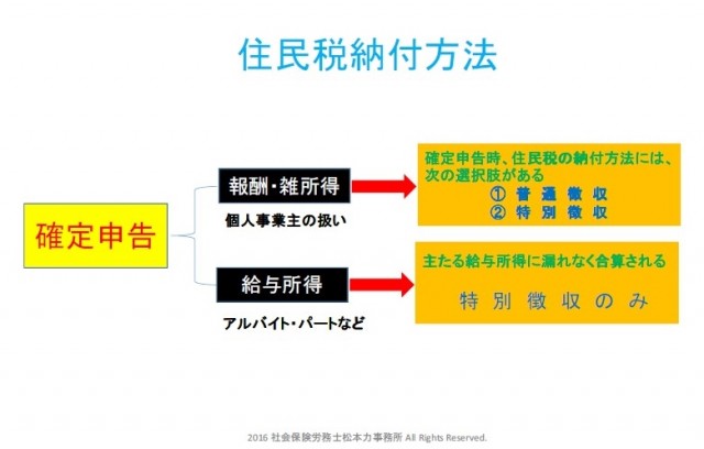 従業員が「普通徴収」にチェックしなかった場合、従業員に代わり住民税を納付(特別徴収) | 確定申告時、普通徴収の選択可 |