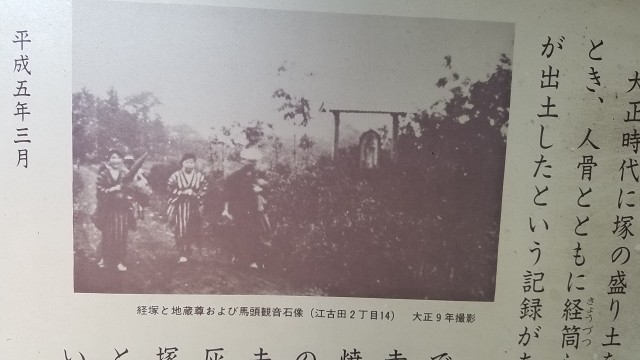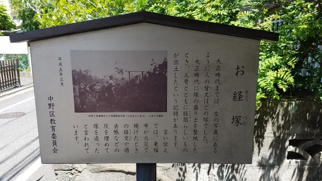 この塚は、元々東福寺の土地であり、大正時代、道路工事のために塚を整地したときに、経筒と合わせて人骨が出土したことから、江古田原・沼袋合戦の戦死者を埋葬した塚であるとも言われています。